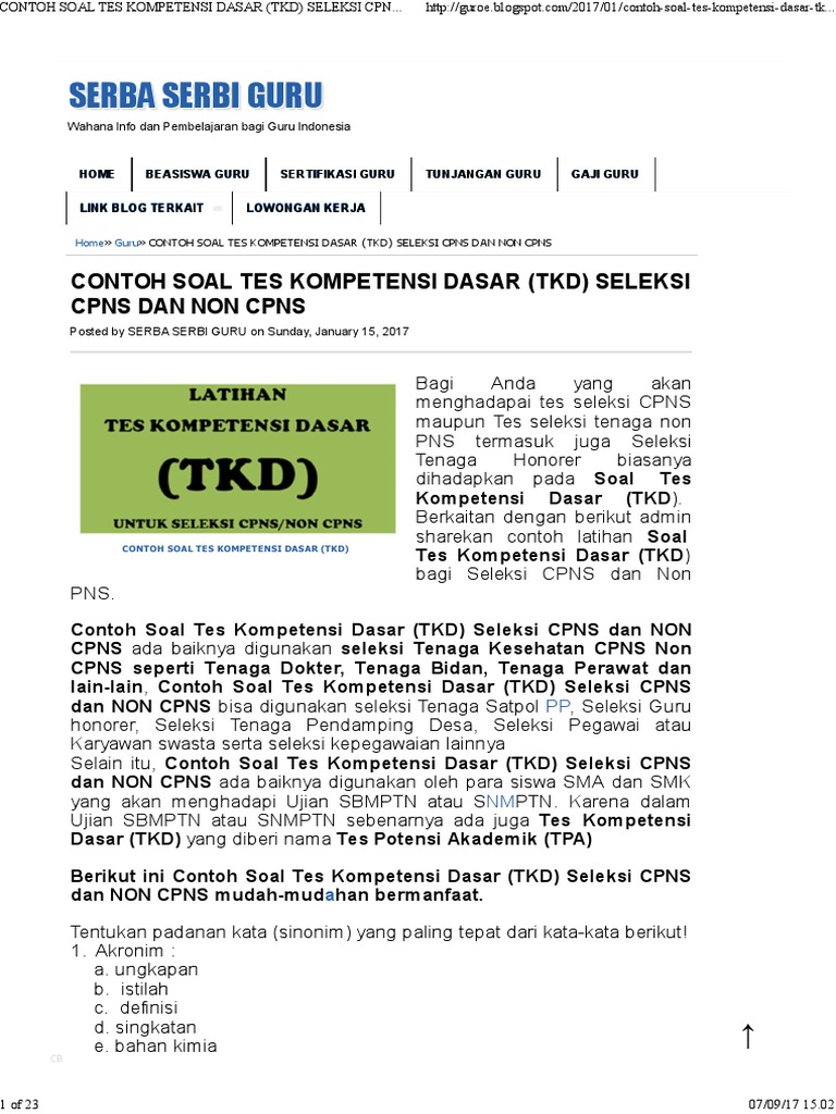 Sesuai permenpan rb nomor (no) 20 tahun 2018 salah satu tes yang harus dilalui calon cpns adalah seleksi kompetensi sasar skd cpns yang dulu dikenal dengan istilah tkd (tes kompetensi dasar) cpns. Berakhirnya perangdingintidak membuat organisasi gerakan non blok kehilangan makna dan relevansinya karena kerjasama itu. 145 pelamar penyuluh agama islam non pns lulus berkas. Download soal utbk sbmptn 2019 lengkap pdf doc seleksi bersama masuk perguruan tinggi negeri sbmptn 2019 contoh soal cpns tkd. Contoh soal cpns sudah banyak beredar di internet.